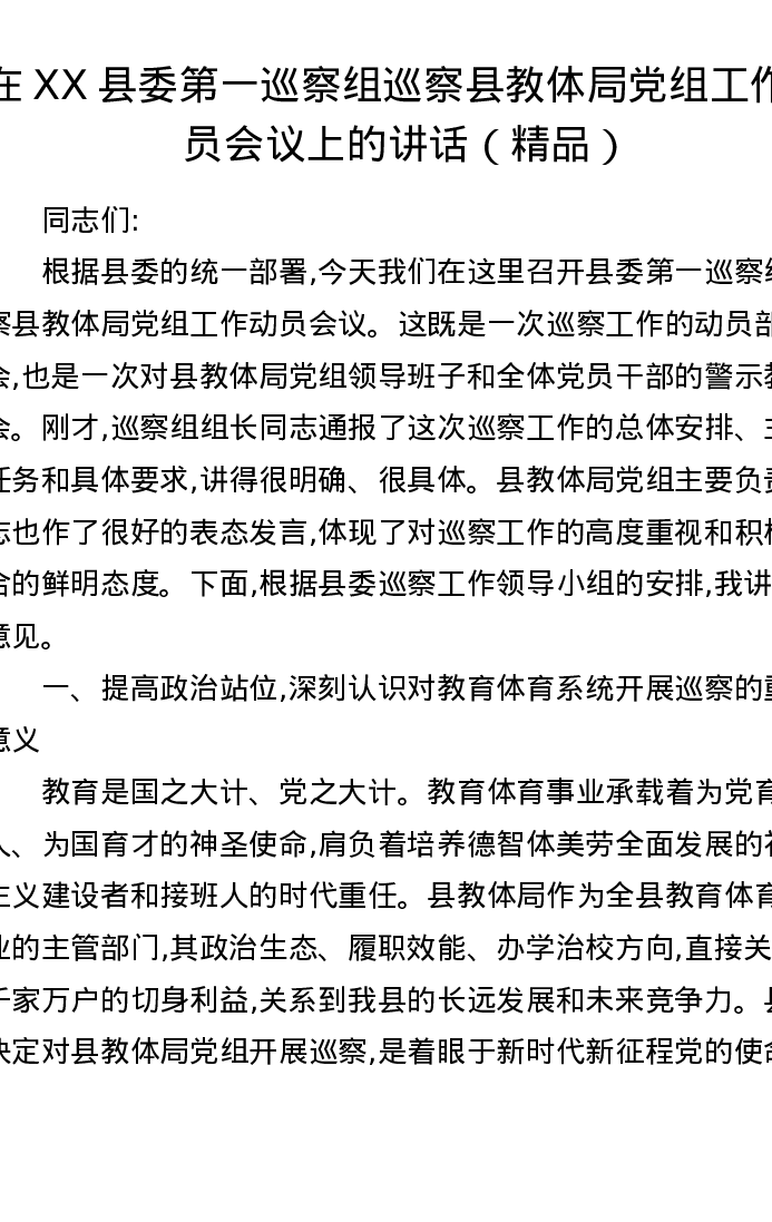 在XX县委第一巡察组巡察县教体局党组工作动员会议上的讲话
