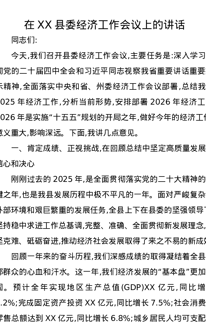 在XX县委经济工作会议上的讲话