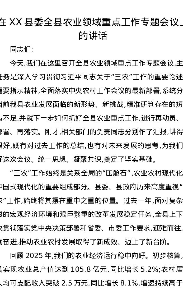 在XX县委全县农业领域重点工作专题会议上的讲话