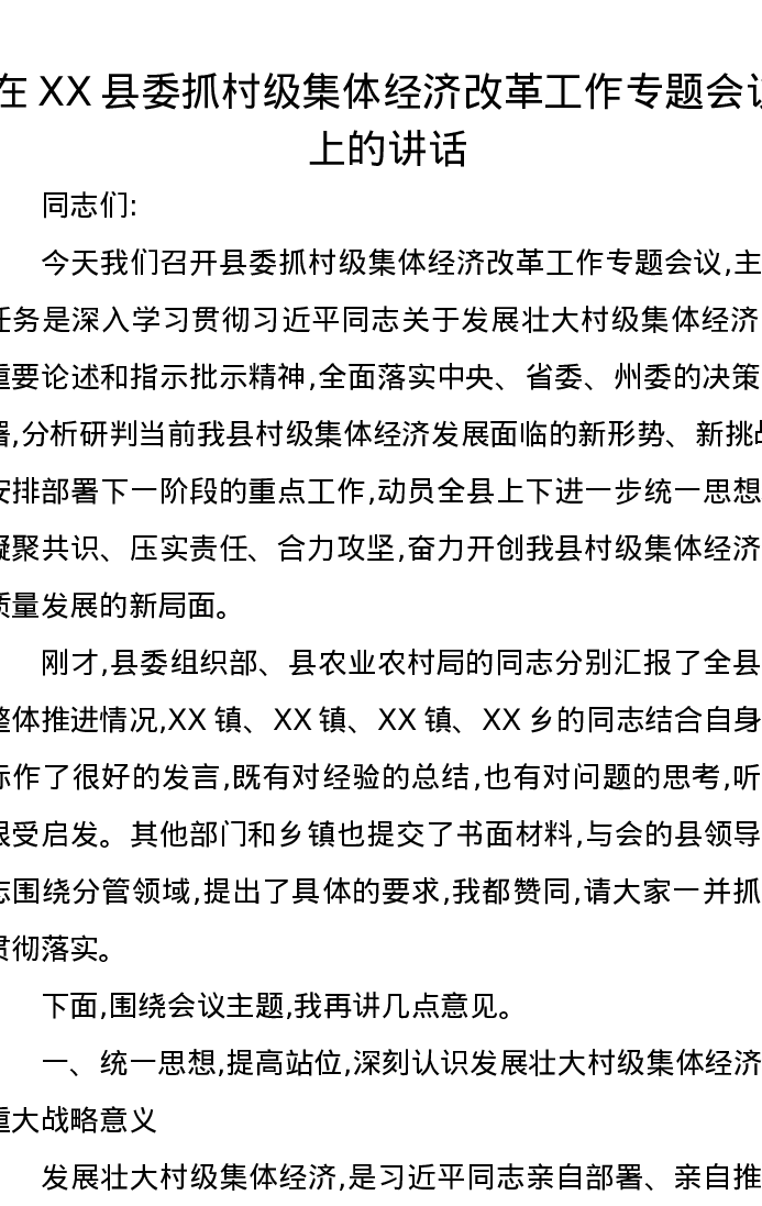 在XX县委抓村级集体经济改革工作专题会议上的讲话