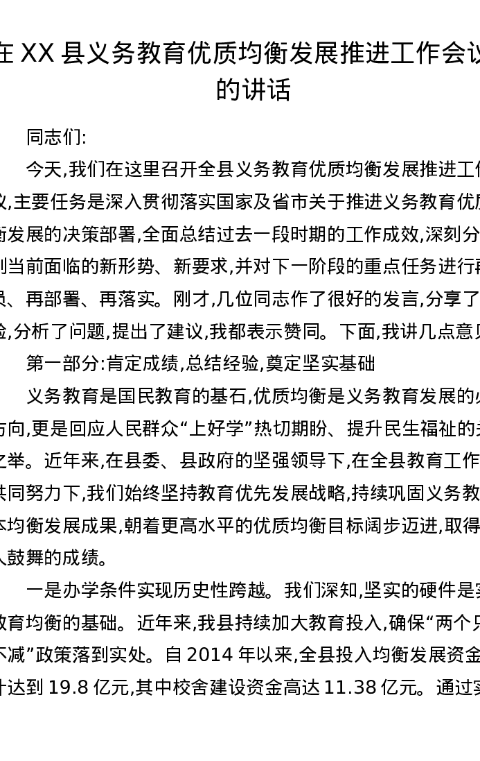 在XX县义务教育优质均衡发展推进工作会议上的讲话