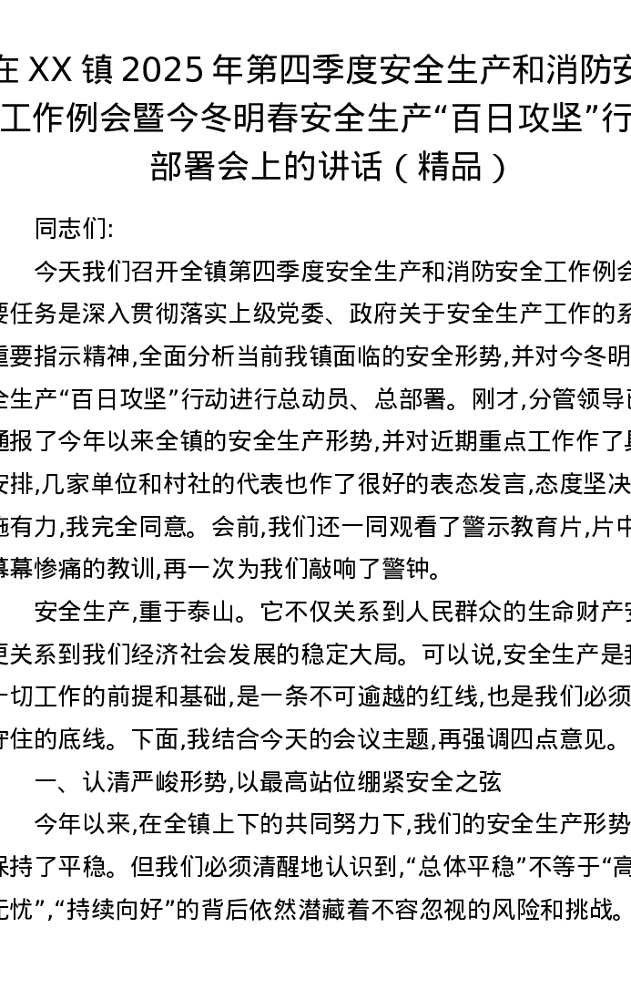 在XX镇2025年第四季度安全生产和消防安全工作例会暨今冬明春安全生产百日攻坚行动部署会上的讲话
