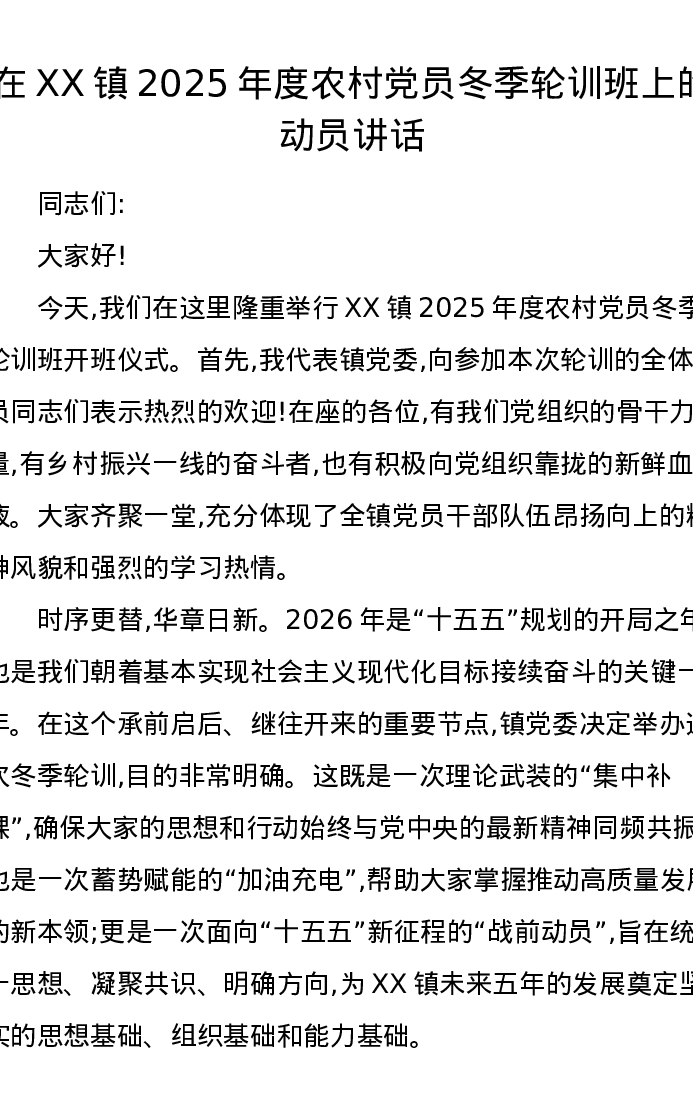 在XX镇2025年度农村党员冬季轮训班上的动员讲话