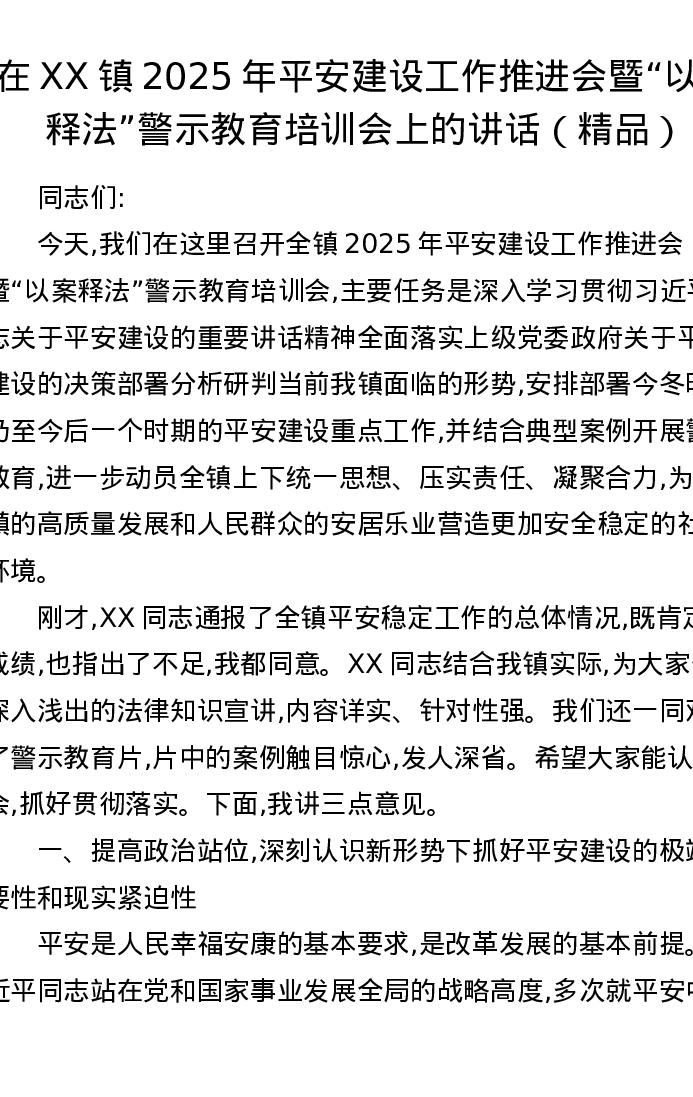 在XX镇2025年平安建设工作推进会暨以案释法警示教育培训会上的讲话