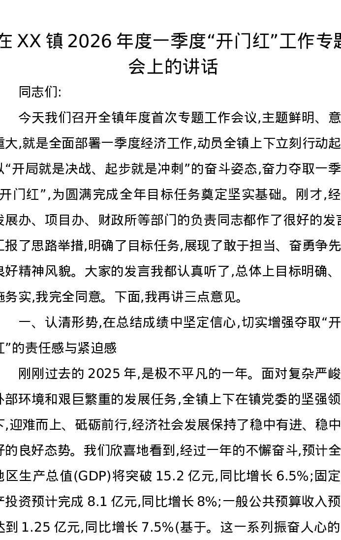 在XX镇2026年度一季度开门红工作专题会上的讲话