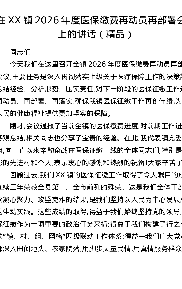 在XX镇2026年度医保缴费再动员再部署会议上的讲话
