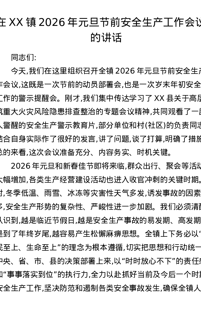 在XX镇2026年元旦节前安全生产工作会议上的讲话