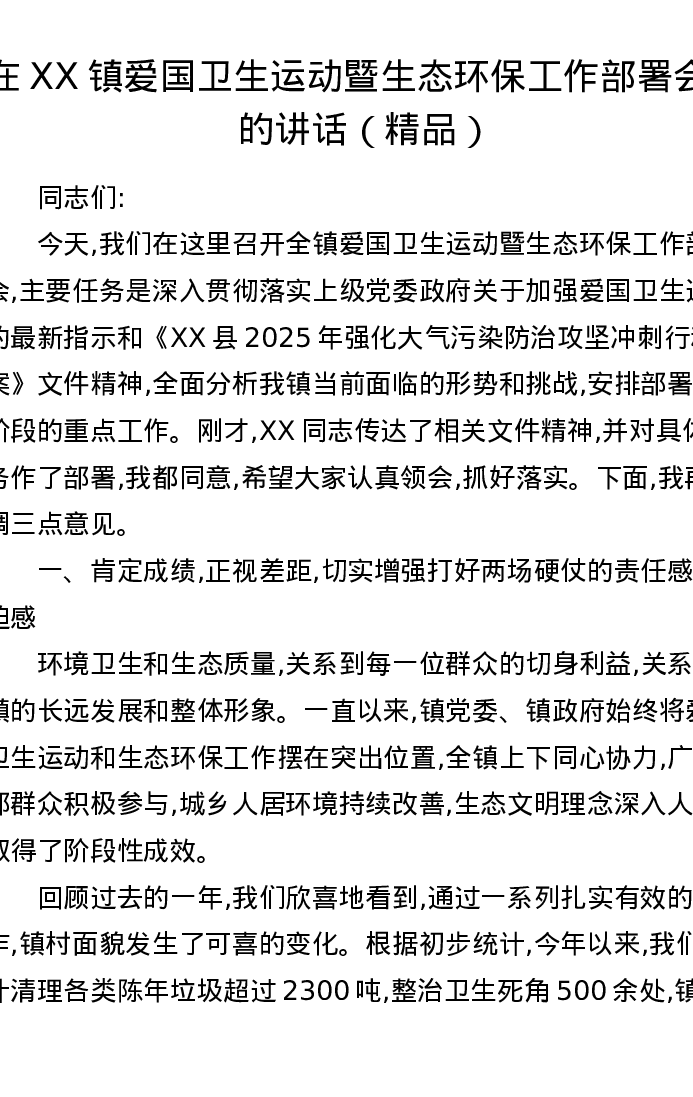 在XX镇爱国卫生运动暨生态环保工作部署会上的讲话