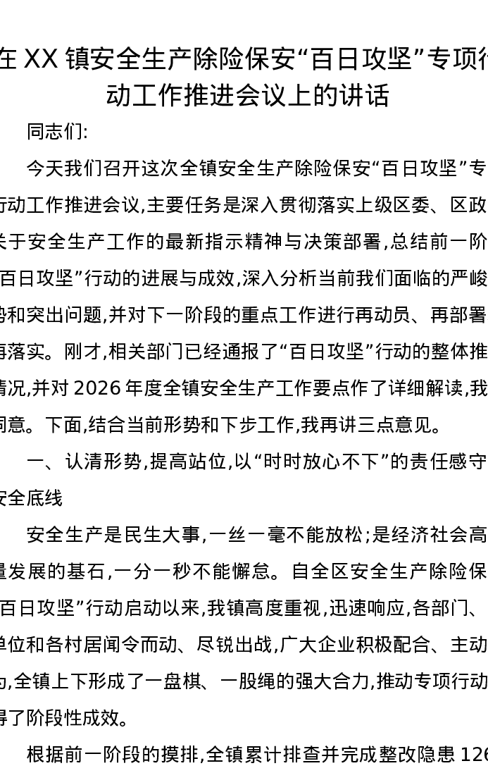 在XX镇安全生产除险保安百日攻坚专项行动工作推进会议上的讲话