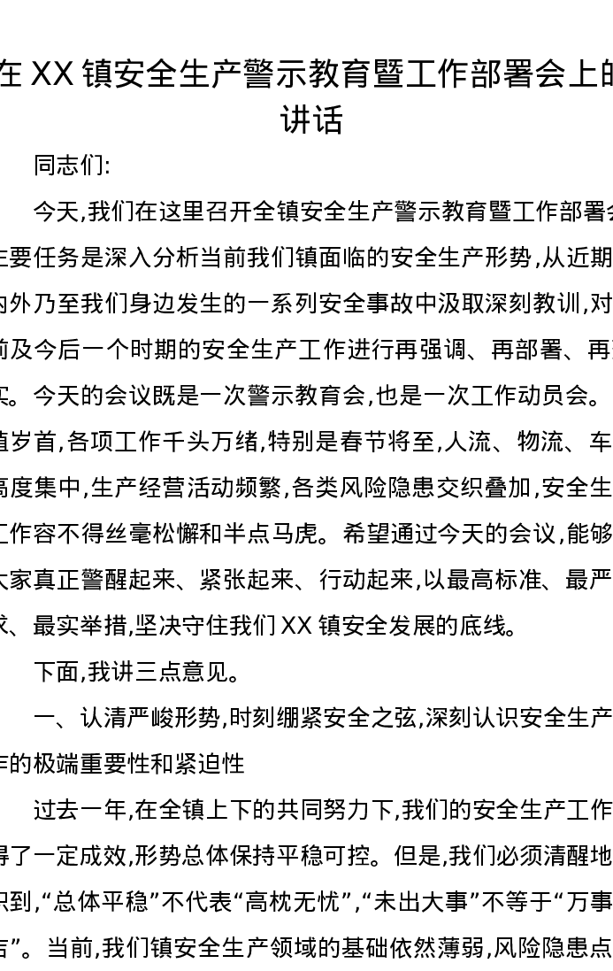在XX镇安全生产警示教育暨工作部署会上的讲话
