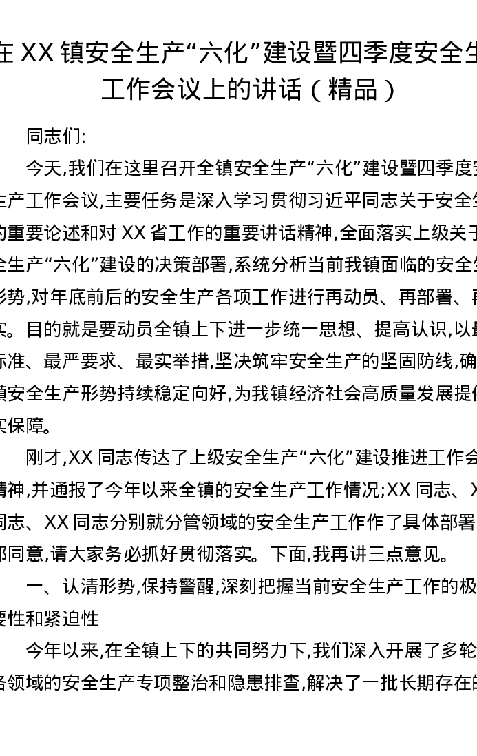 在XX镇安全生产六化建设暨四季度安全生产工作会议上的讲话