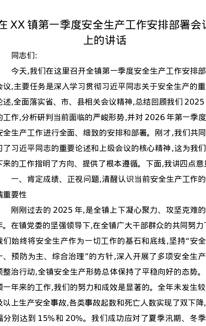 在XX镇第一季度安全生产工作安排部署会议上的讲话