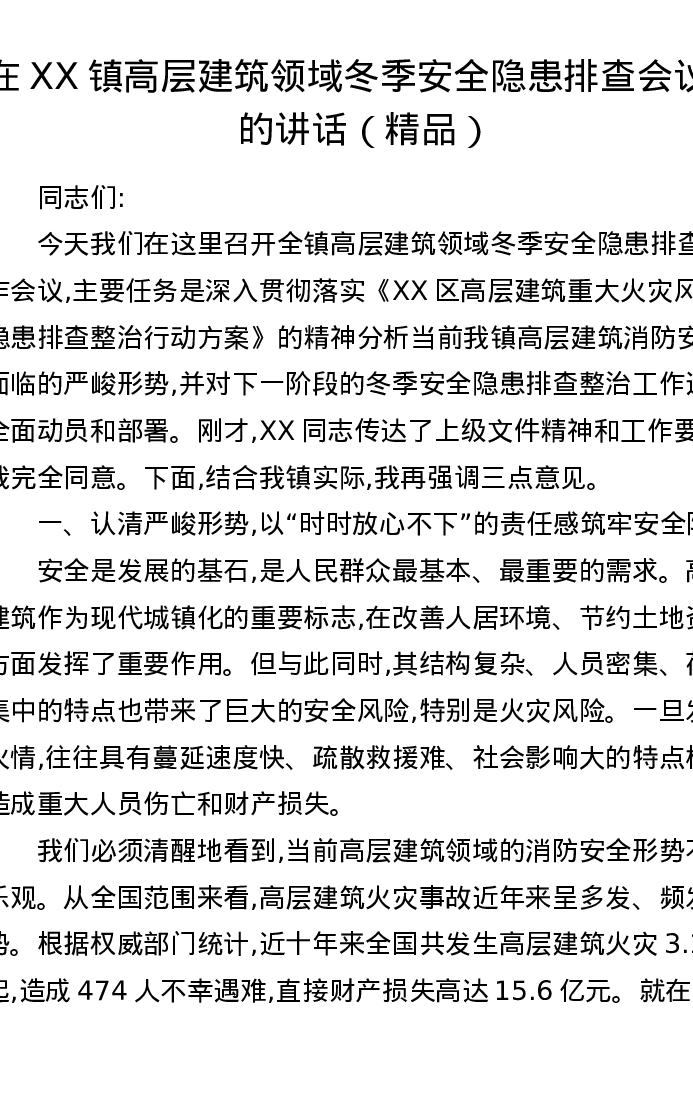 在XX镇高层建筑领域冬季安全隐患排查会议上的讲话