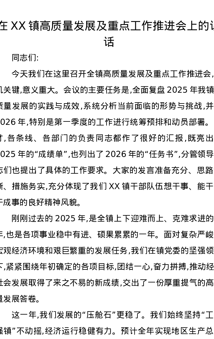 在XX镇高质量发展及重点工作推进会上的讲话