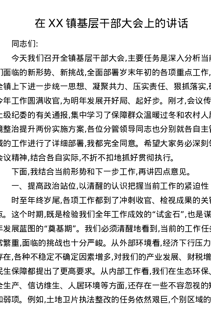 在XX镇基层干部大会上的讲话