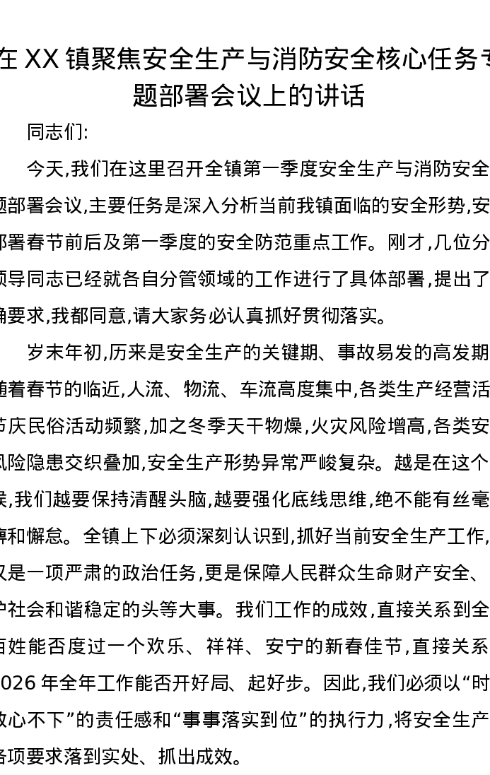 在XX镇聚焦安全生产与消防安全核心任务专题部署会议上的讲话