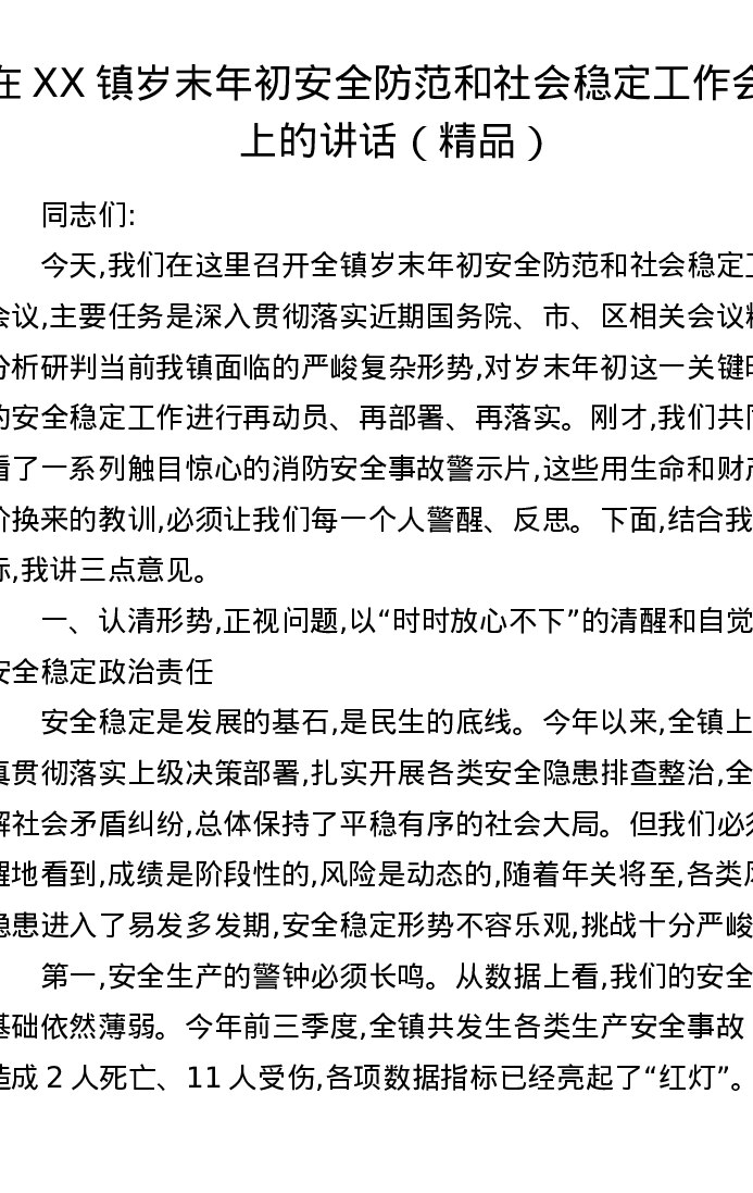 在XX镇岁末年初安全防范和社会稳定工作会议上的讲话