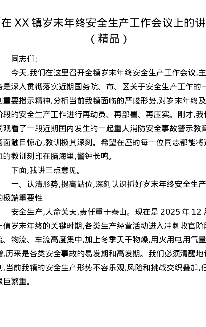 在XX镇岁末年终安全生产工作会议上的讲话