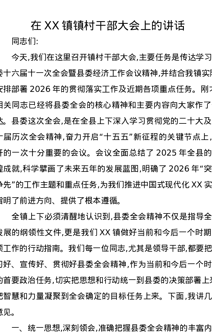 在XX镇镇村干部大会上的讲话3