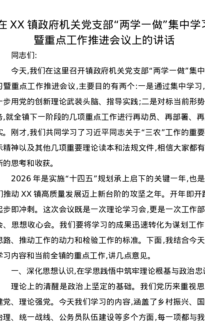 在XX镇政府机关党支部两学一做集中学习暨重点工作推进会议上的讲话