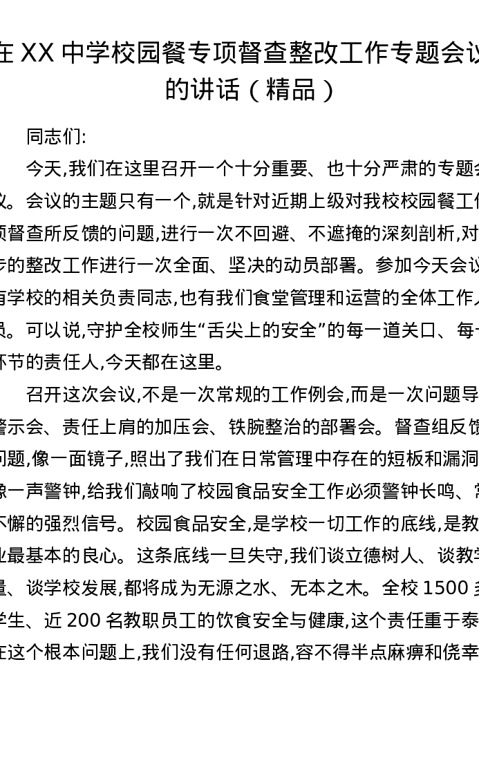 在XX中学校园餐专项督查整改工作专题会议上的讲话