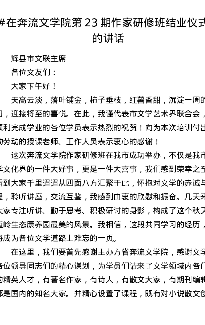 在奔流文学院第23期作家研修班结业仪式上的讲话