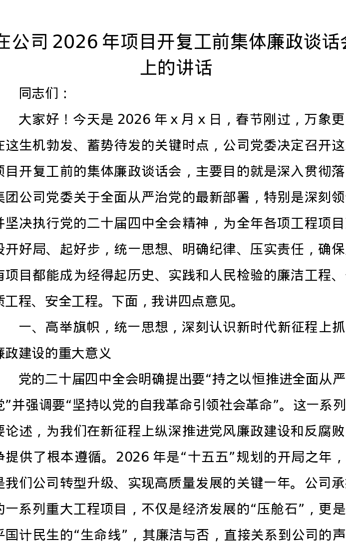 在公司2026年项目开复工前集体廉政谈话会上的讲话