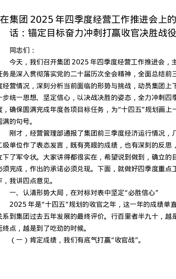 在集团2025年四季度经营工作推进会上的讲话:锚定目标奋力冲刺 打赢收官决胜战役
