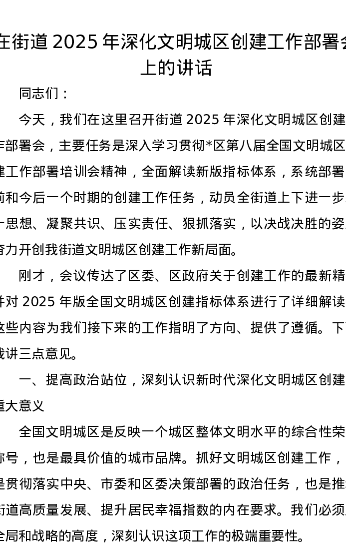 在街道2025年深化文明城区创建工作部署会上的讲话