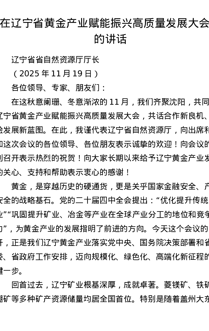 在辽宁省黄金产业赋能振兴高质量发展大会上的讲话