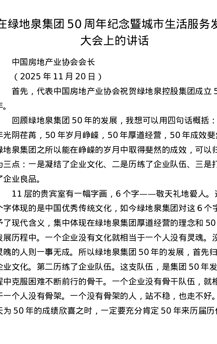 在绿地泉集团50周年纪念暨城市生活服务发展大会上的讲话