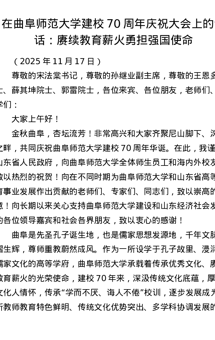在曲阜师范大学建校70周年庆祝大会上的讲话:赓续教育薪火勇担强国使命