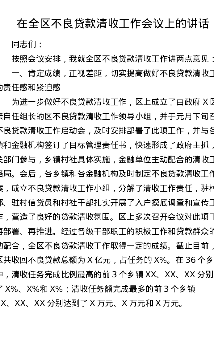 在全区不良贷款清收工作会议上的讲话