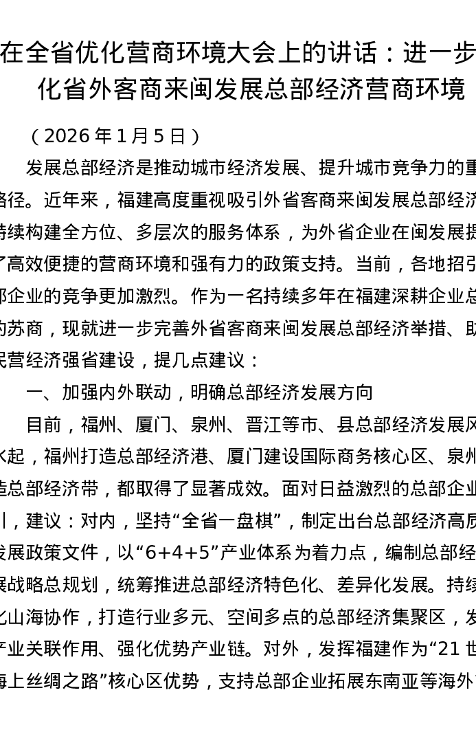 在全省优化营商环境大会上的讲话:进一步优化省外客商来闽发展总部经济营商环境