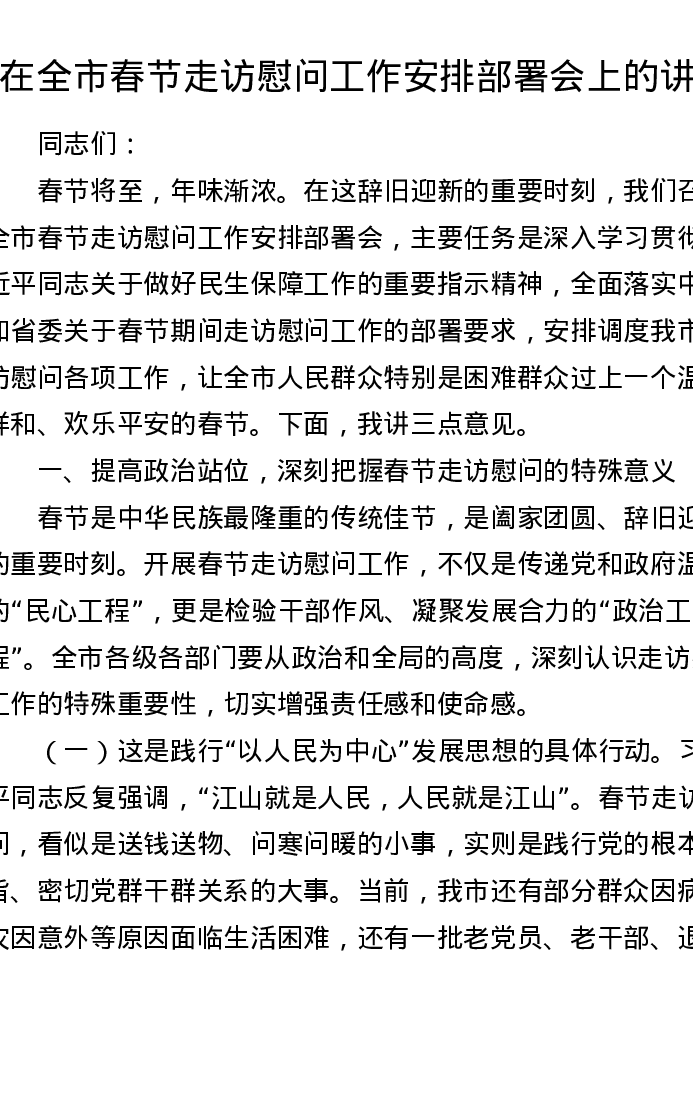在全市春节走访慰问工作安排部署会上的讲话