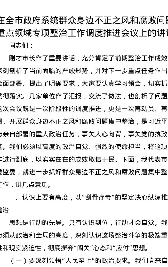 在全市政府系统群众身边不正之风和腐败问题重点领域专项整治工作调度推进会议上的讲话