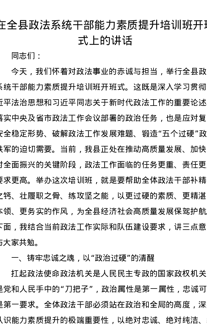 在全县政法系统干部能力素质提升培训班开班式上的讲话