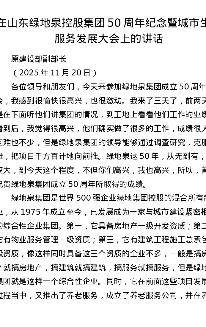 在山东绿地泉控股集团50周年纪念暨城市生活服务发展大会上的讲话