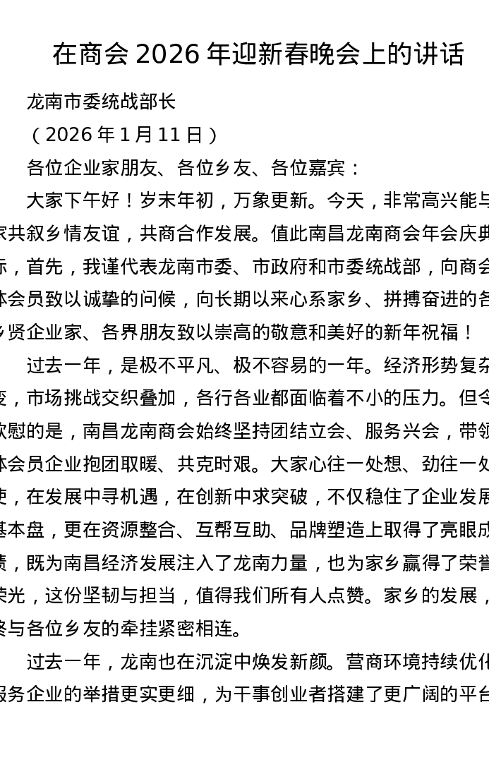 在商会2026年迎新春晚会上的讲话