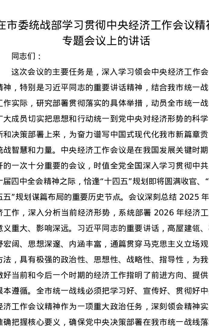 在市委统战部学习贯彻中央经济工作会议精神专题会议上的讲话