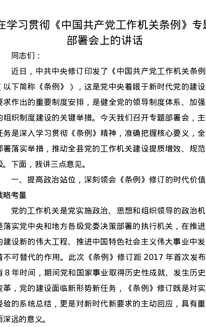 在学习贯彻《中国共产党工作机关条例》专题部署会上的讲话