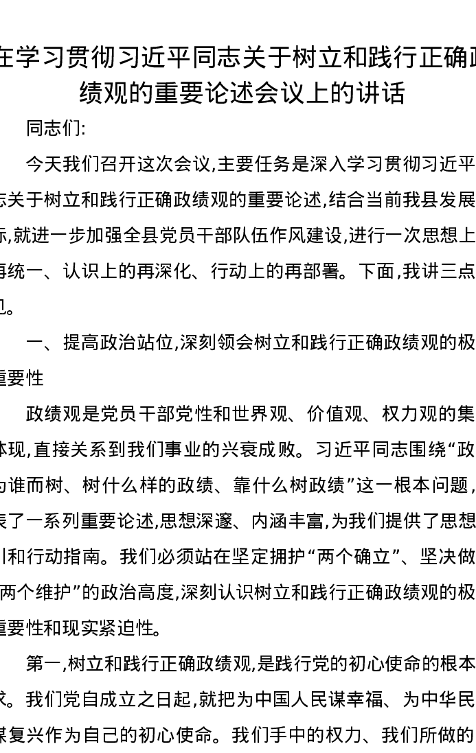 在学习贯彻习近平总书记关于树立和践行正确政绩观的重要论述会议上的讲话