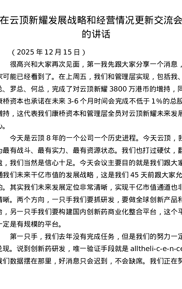 在云顶新耀发展战略和经营情况更新交流会上的讲话