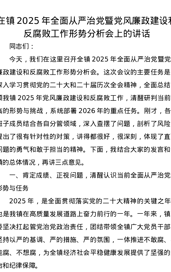 在镇2025年全面从严治党暨党风廉政建设和反腐败工作形势分析会上的讲话