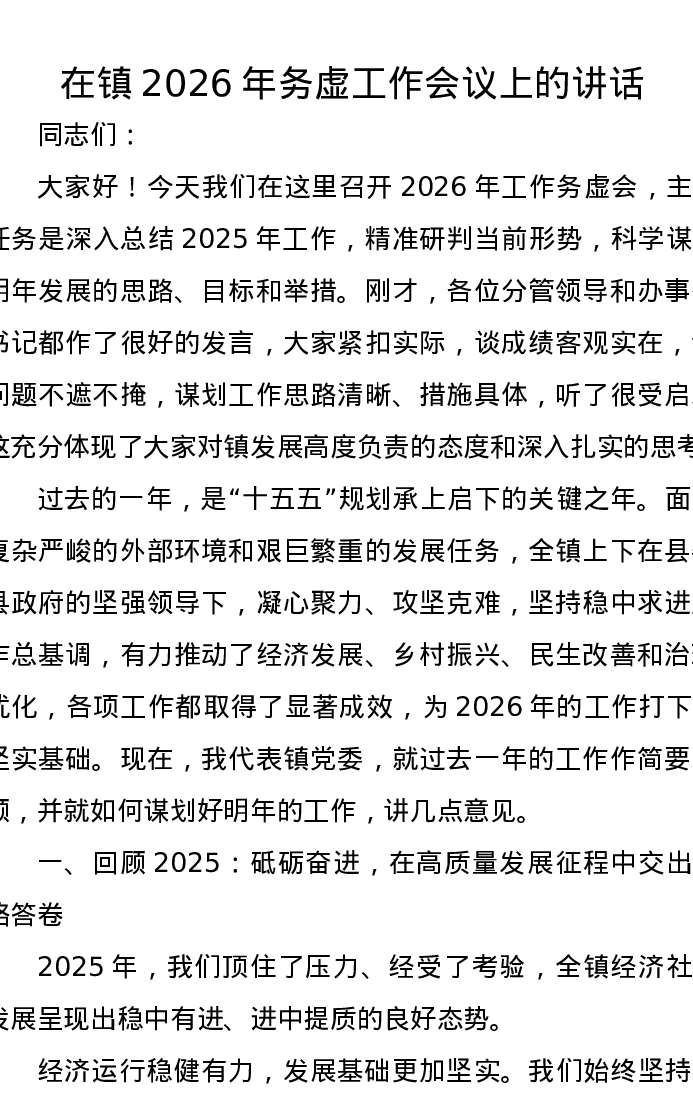 在镇2026年务虚工作会议上的讲话