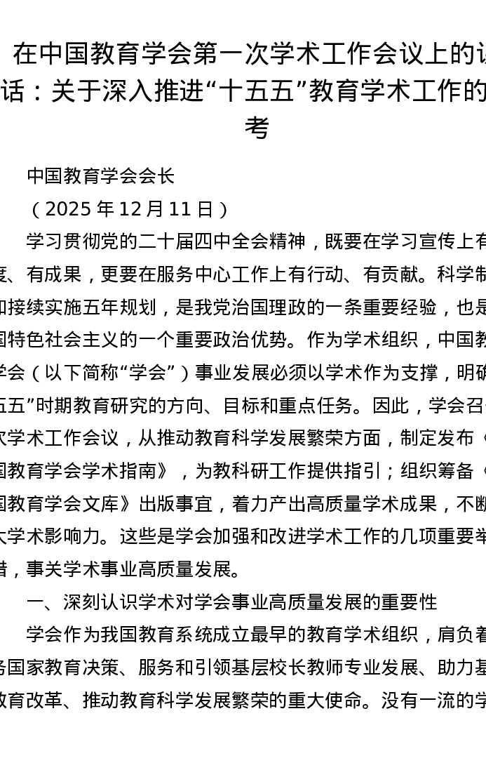 在中国教育学会第一次学术工作会议上的讲话:关于深入推进十五五教育学术工作的思考
