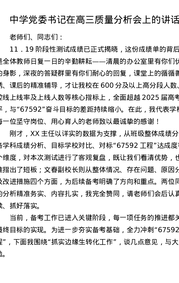 中学党委书记在高三质量分析会上的讲话