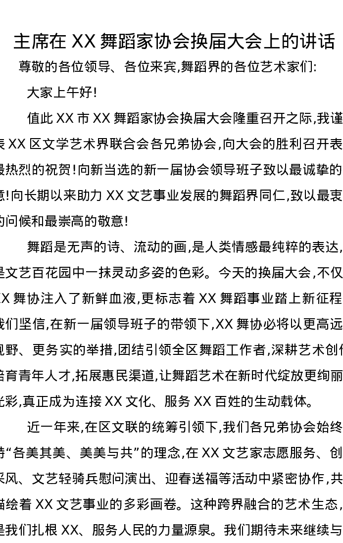 主席在XX舞蹈家协会换届大会上的讲话