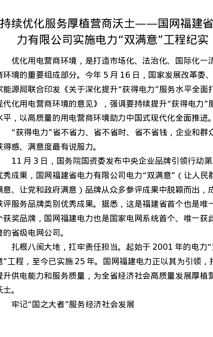 持续优化服务 厚植营商沃土——国网福建省电力有限公司实施电力 双满意 工程纪实