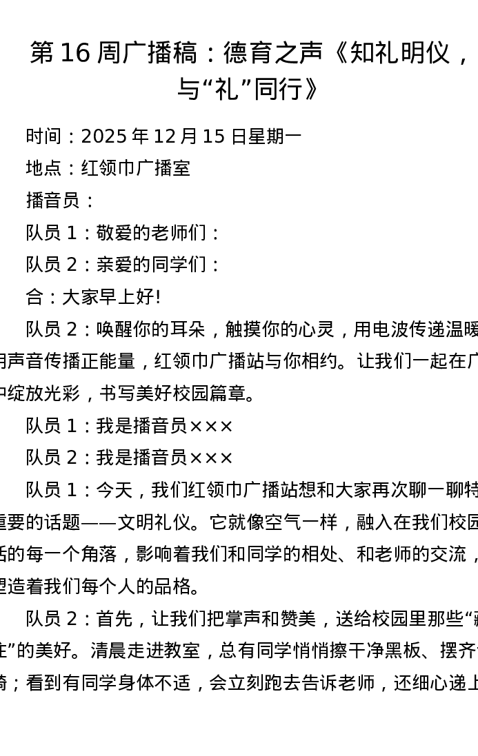 第16周广播稿:德育之声《知礼明仪,与礼同行》